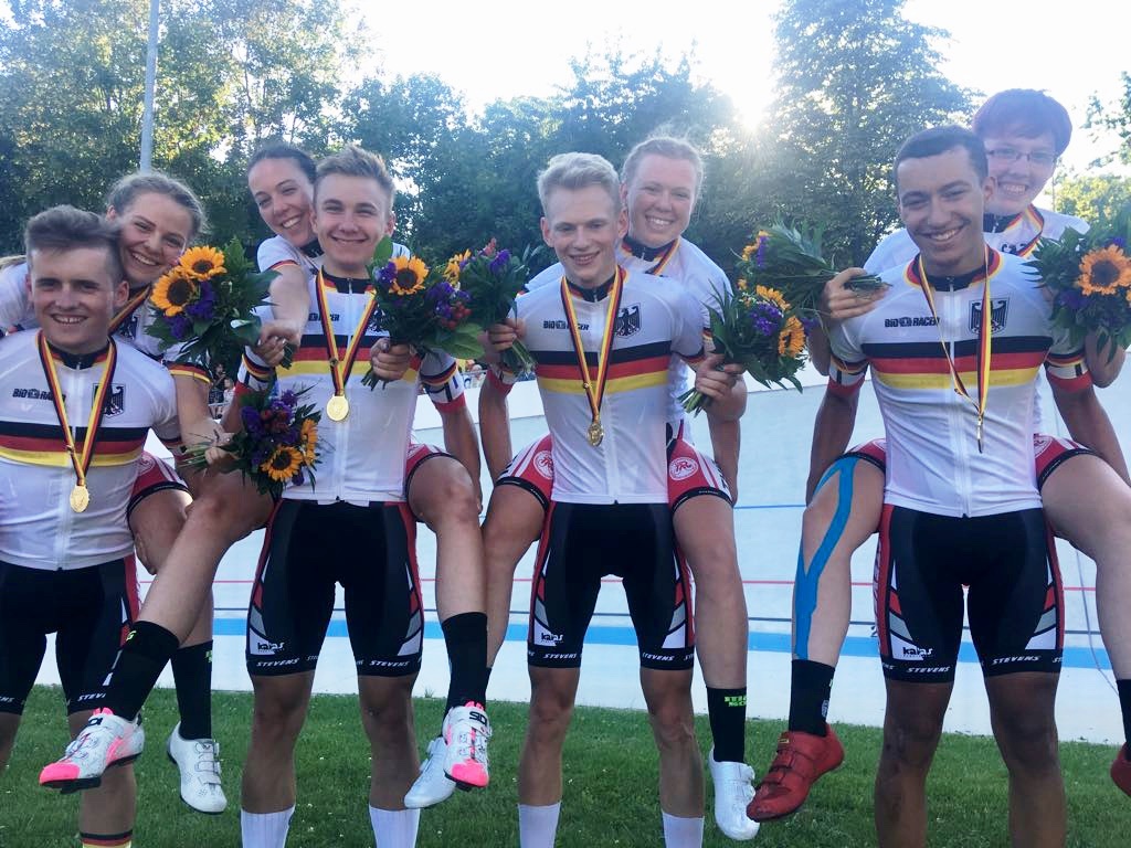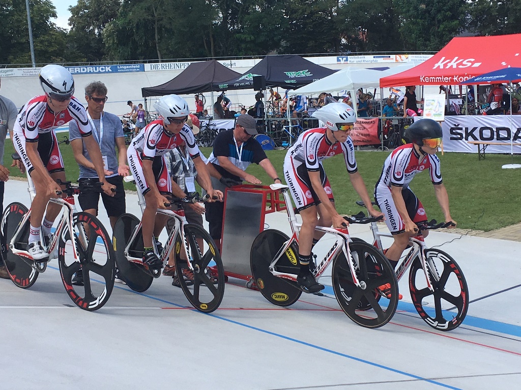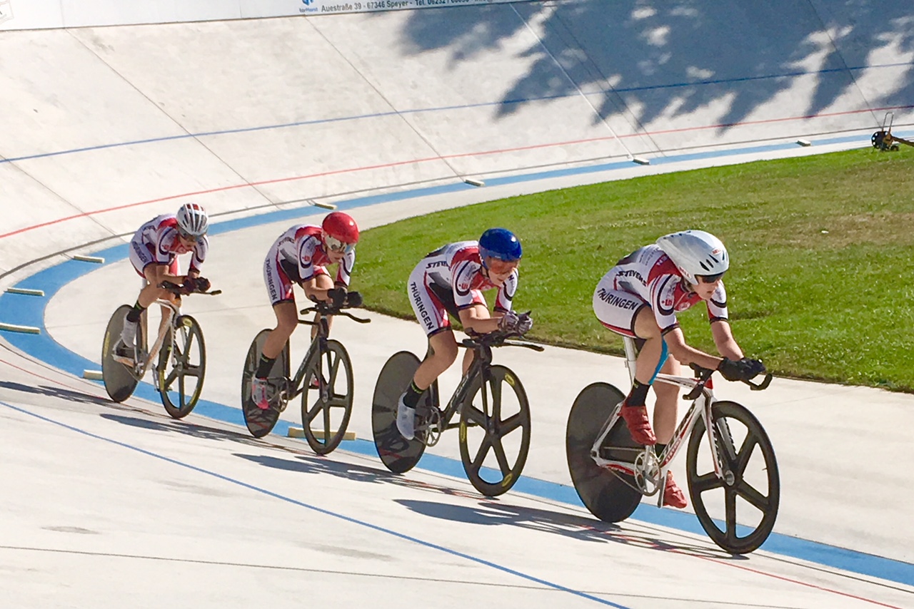 Erfurt. Trainer Michael Beckert ließ mit Unterstützung des Thüringer Radsport-Verbandes (TRV) nichts unversucht, einen schlagkräftigen Bahnrad-Vierer auf die Beine zu stellen. Mit dem Bundestrainer Helmut Taudte stimmte er das Training ab, um auf dem Rad-Oval zusätzliche Übungseinheiten zu absolvieren. Nun hat das junge Quartett vom Stevens Juniorteam Thüringen ein weiteres Erfolgserlebnis gefeiert. Bei der 132. deutschen Bahnrad-Meisterschaft in Dudenhofen (Rheinland-Pfalz) haben Einer-Titelträger Janis Peter (SSV Gera 1990), Vizemeister Milan Henkel sowie Max Gehrmann und Luca Rohde (alle RSC Turbine Erfurt) in der 4000-m-Mannschaftsverfolgung die Goldmedaille gewonnen.